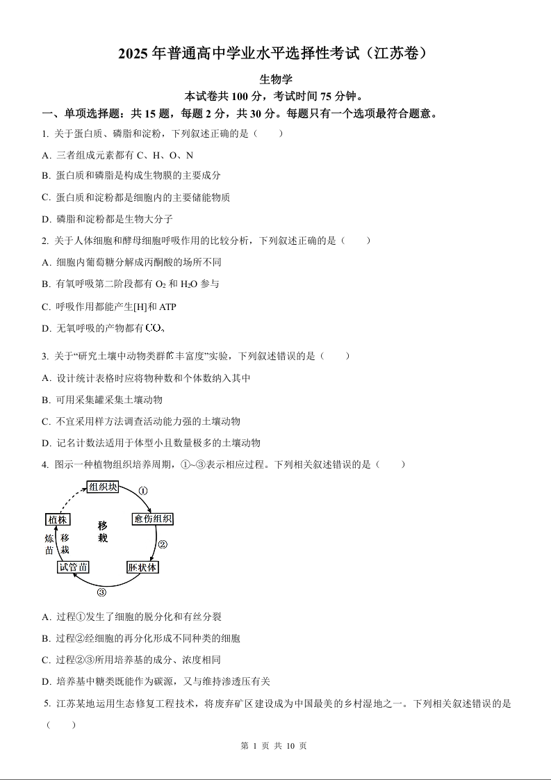 2025年生物高考真题--江苏卷