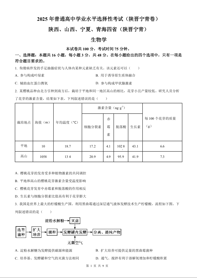2025年生物高考真题--陕西、山西、宁夏、青海四省卷