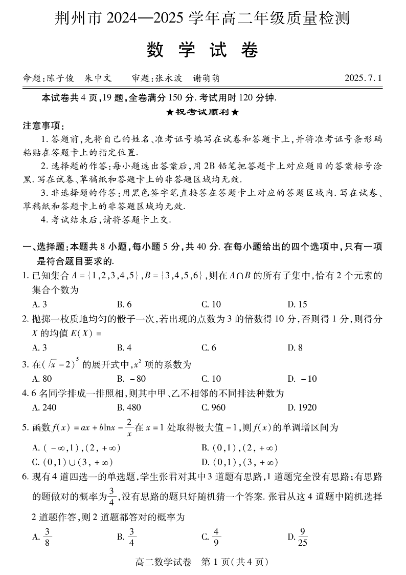 湖北省荆州市2024-2025学年高二下学期7月期末考试数学+答案