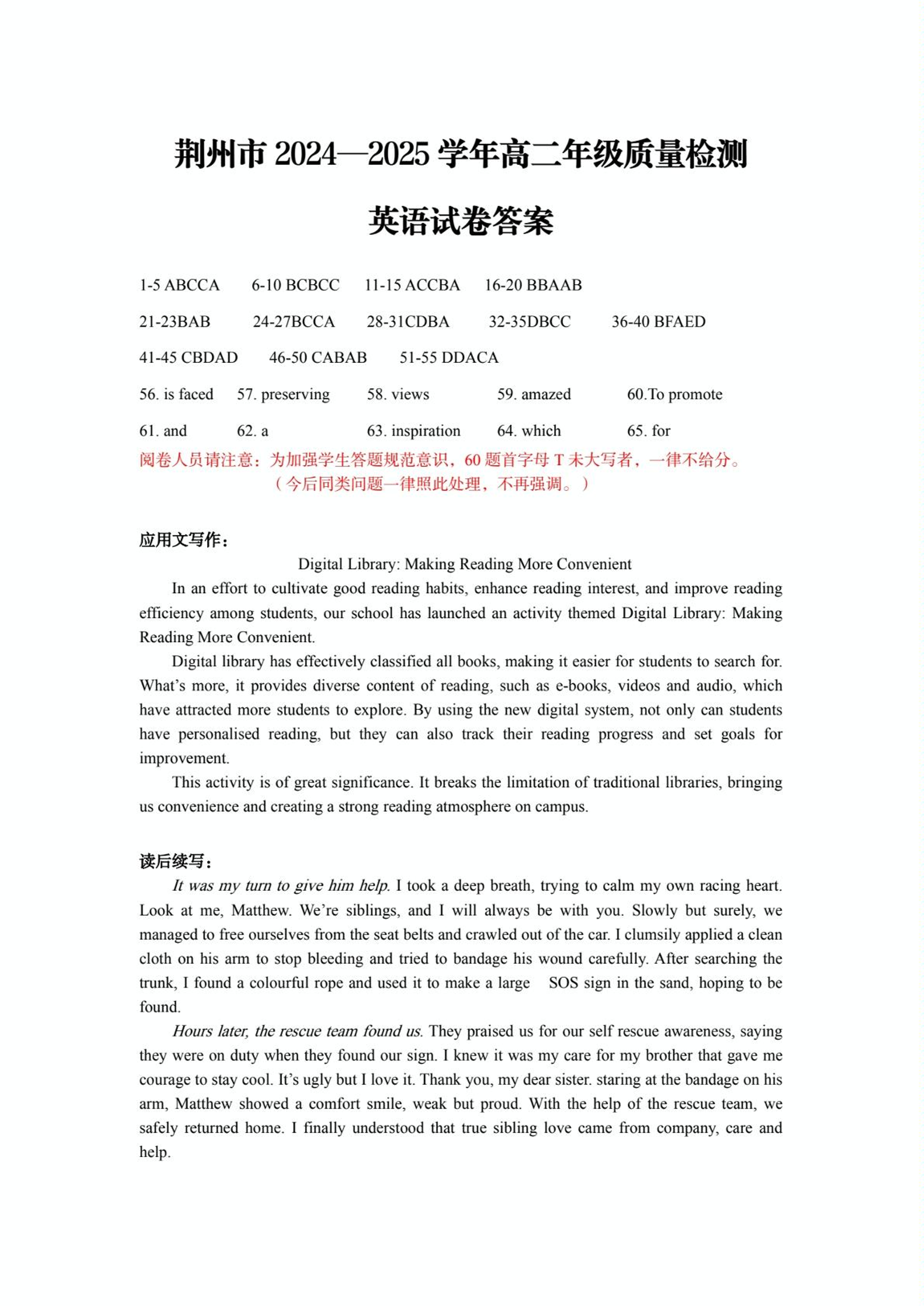 湖北省荆州市2024-2025学年高二下学期7月期末考试英语答案