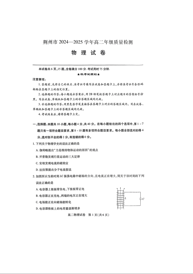 湖北省荆州市2024-2025学年高二下学期7月期末考试物理