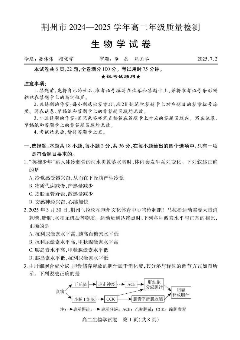 湖北省荆州市2024-2025学年高二下学期7月期末考试生物+答案
