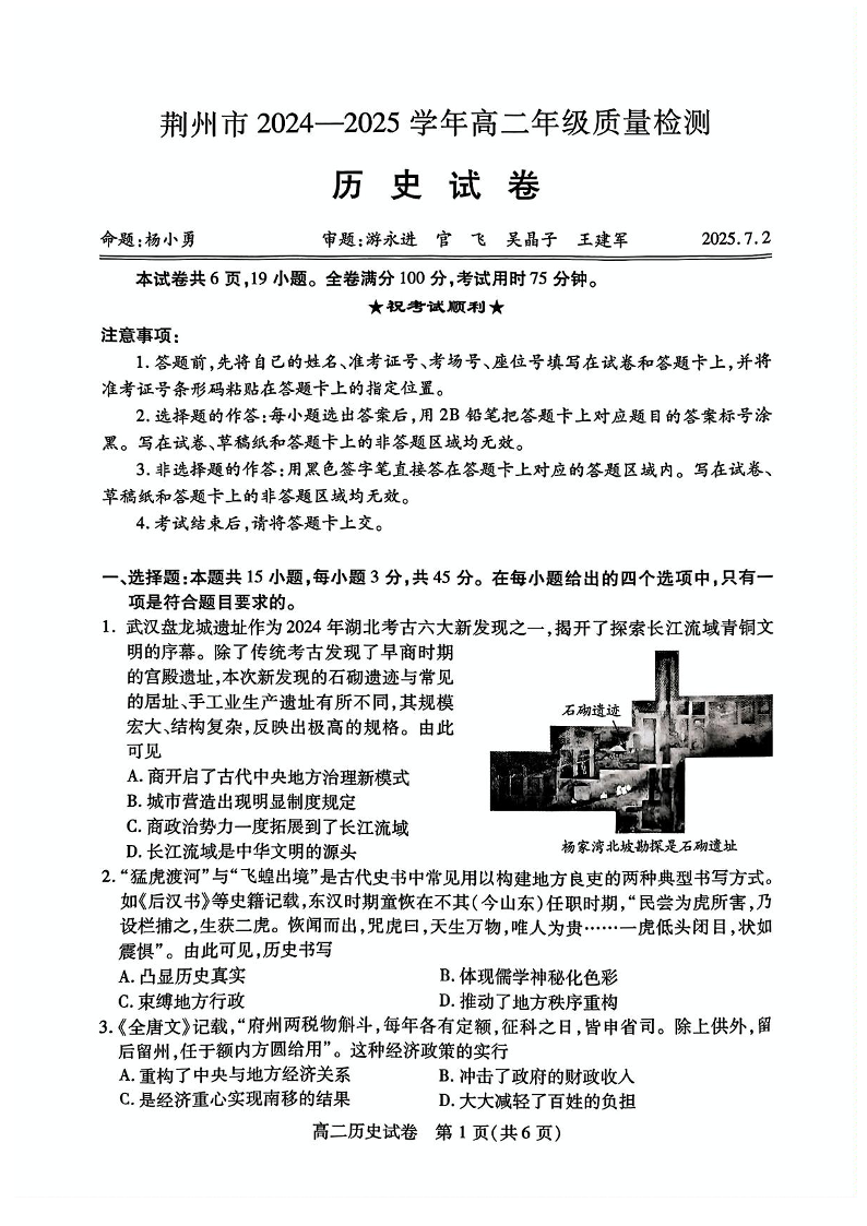 湖北省荆州市2024-2025学年高二下学期7月期末考试历史+答案