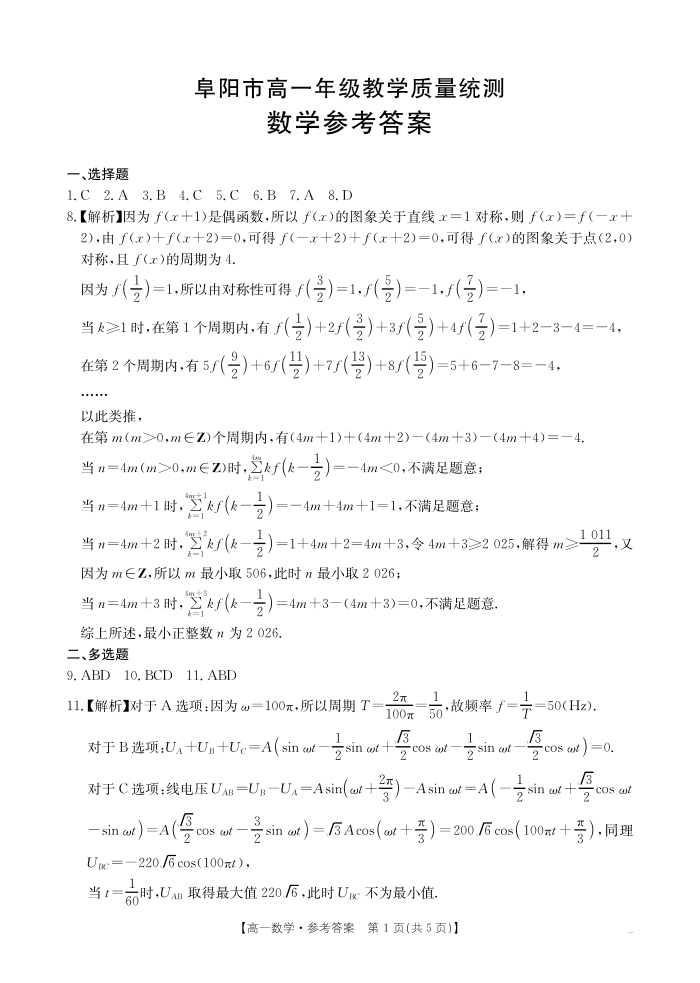 安徽省阜阳市2024-2025学年高一下学期7月期末考试数学答案