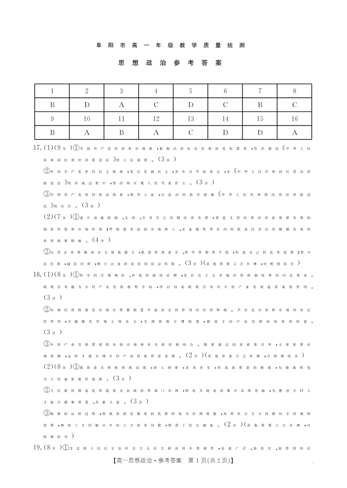 安徽省阜阳市2024-2025学年高一下学期7月期末考试政治答案