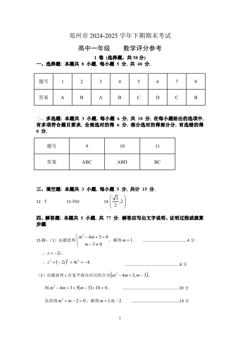 河南省郑州市2024一2025学年高一下期期末考试数学答案