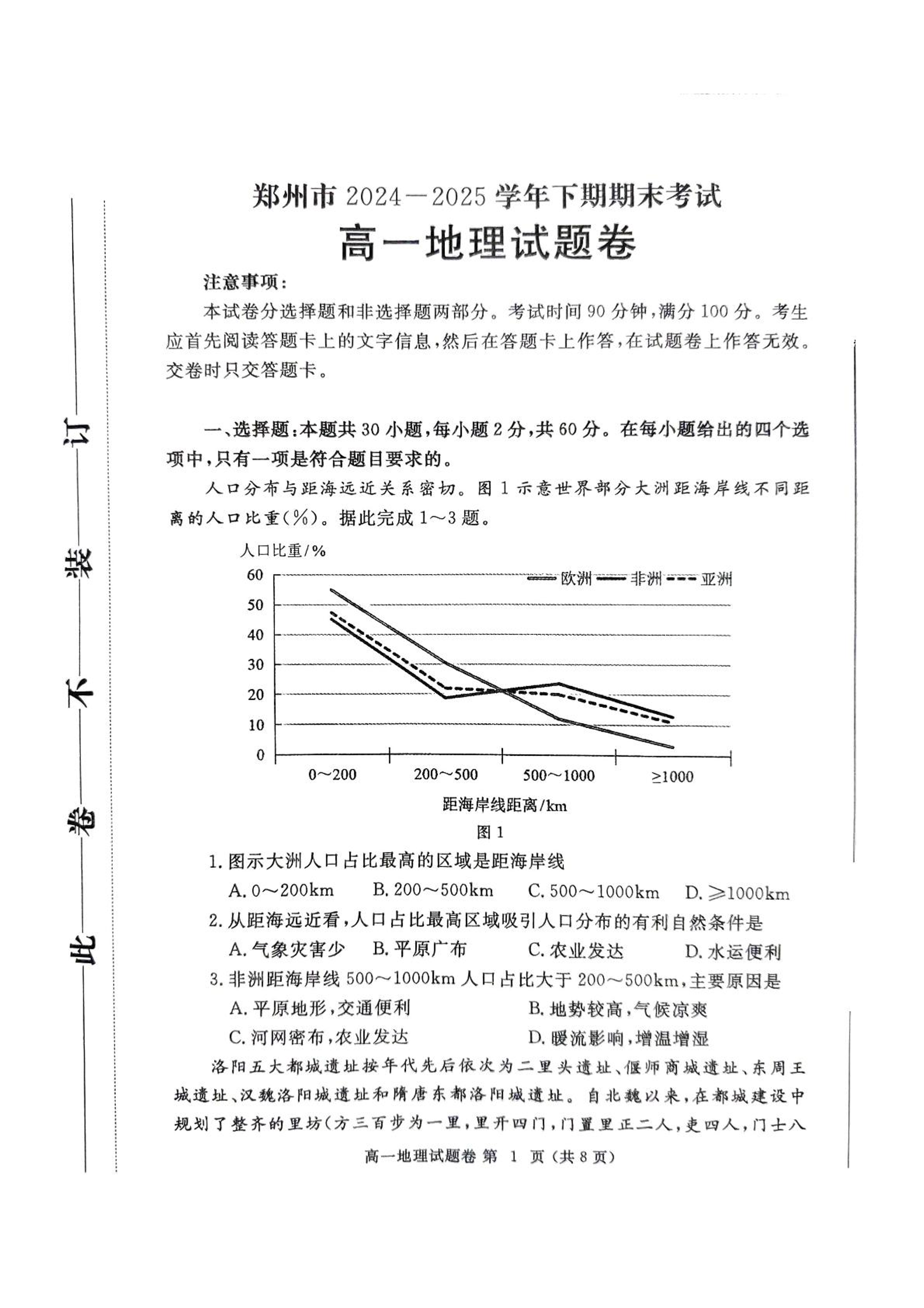 河南省郑州市2024一2025学年高一下期期末考试地理