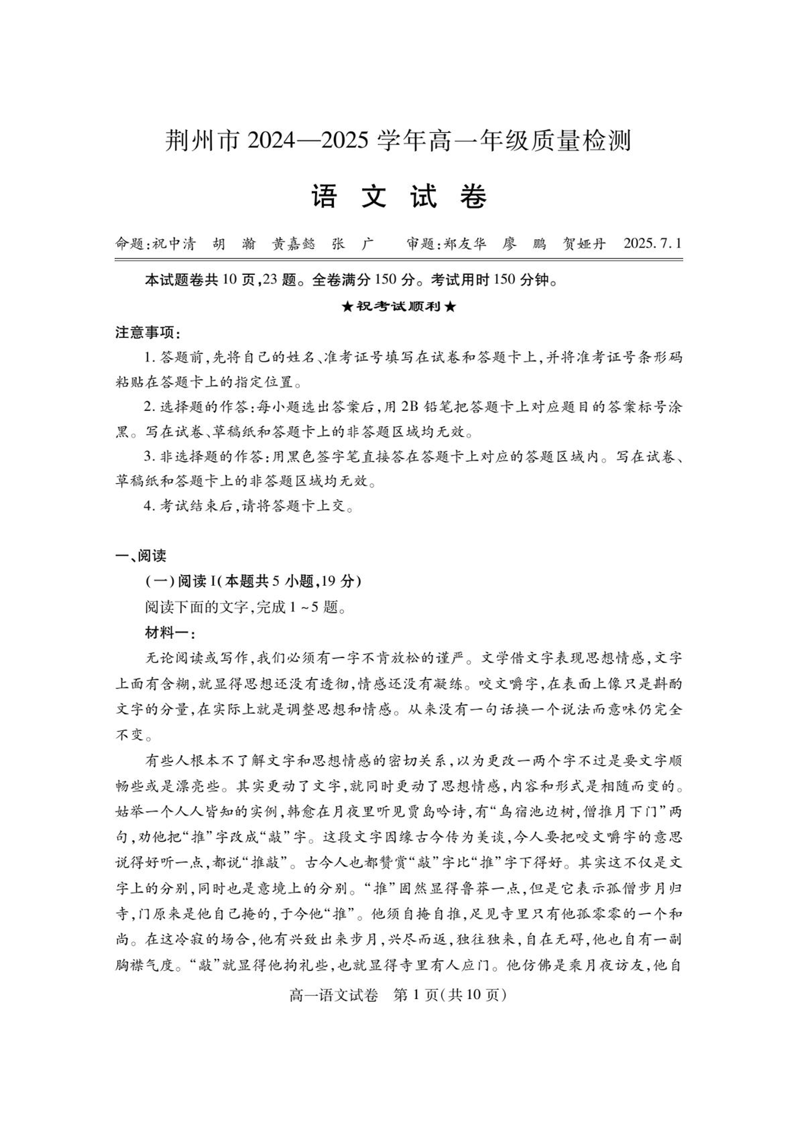 湖北省荆州市2024一2025学年高一年级质量检测语文