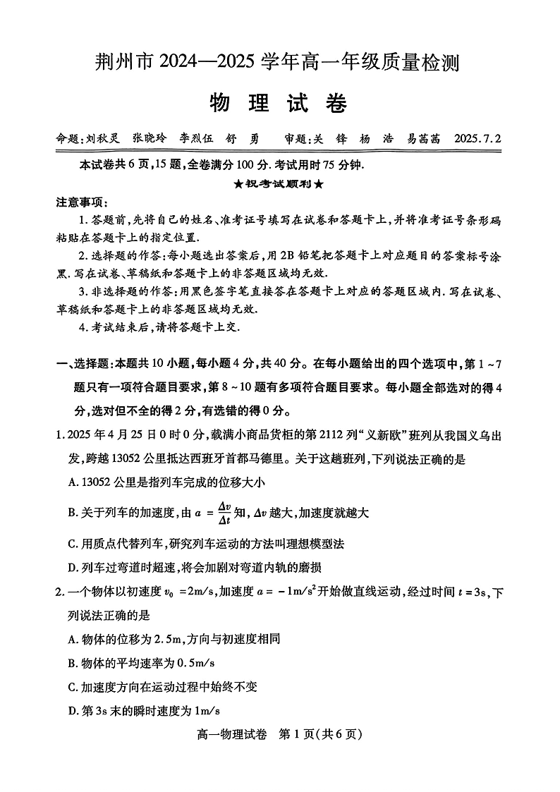 湖北省荆州市2024一2025学年高一年级质量检测物理+答案