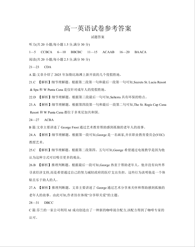 江西省2024-2025学年高一下学期6月联考英语答案