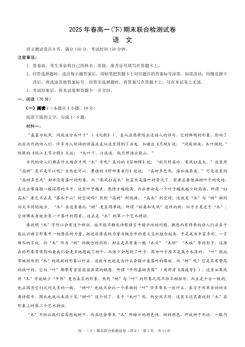 重庆市2025年高一下学期期末联合检测(康德卷)语文