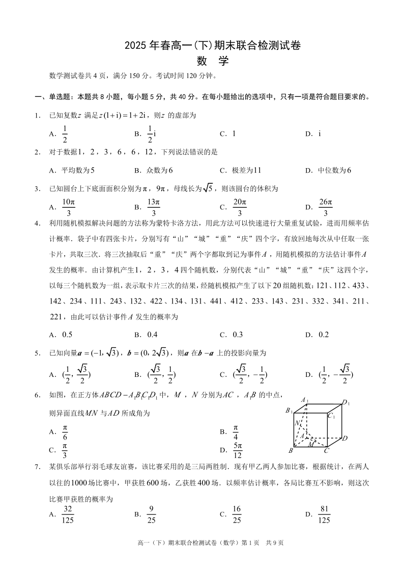 重庆市2025年高一下学期期末联合检测(康德卷)数学