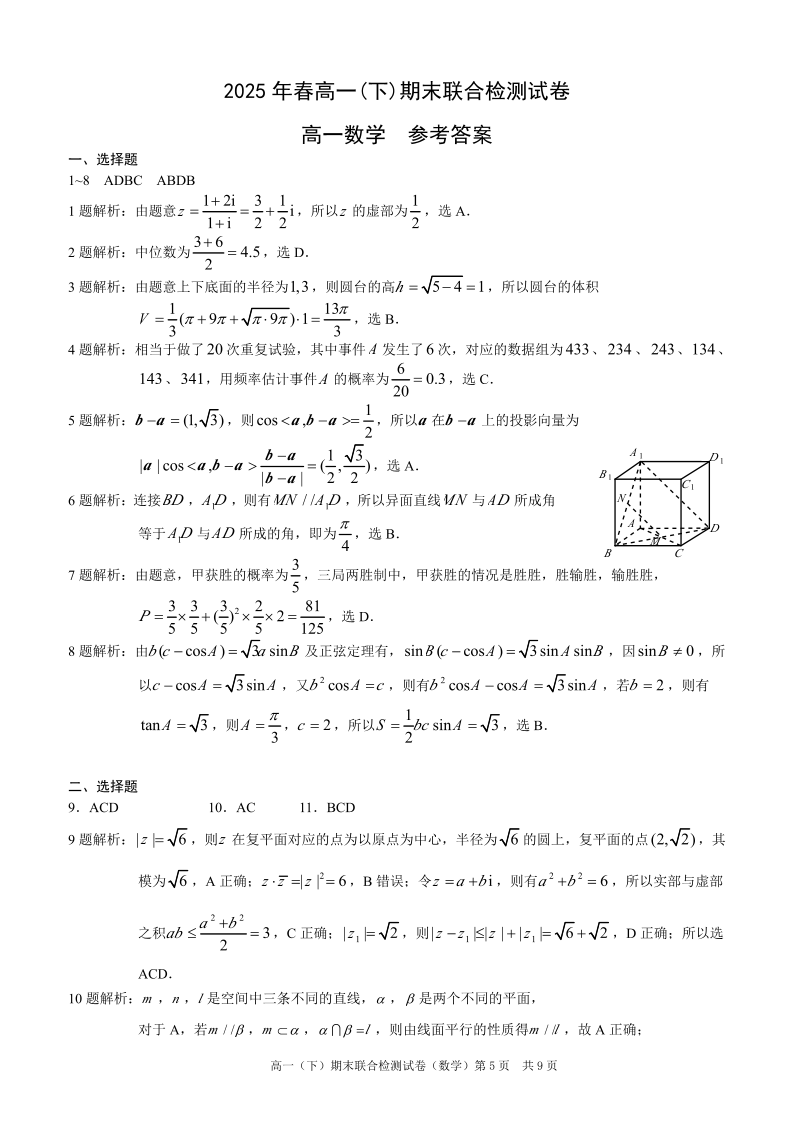 重庆市2025年高一下学期期末联合检测(康德卷)数学答案