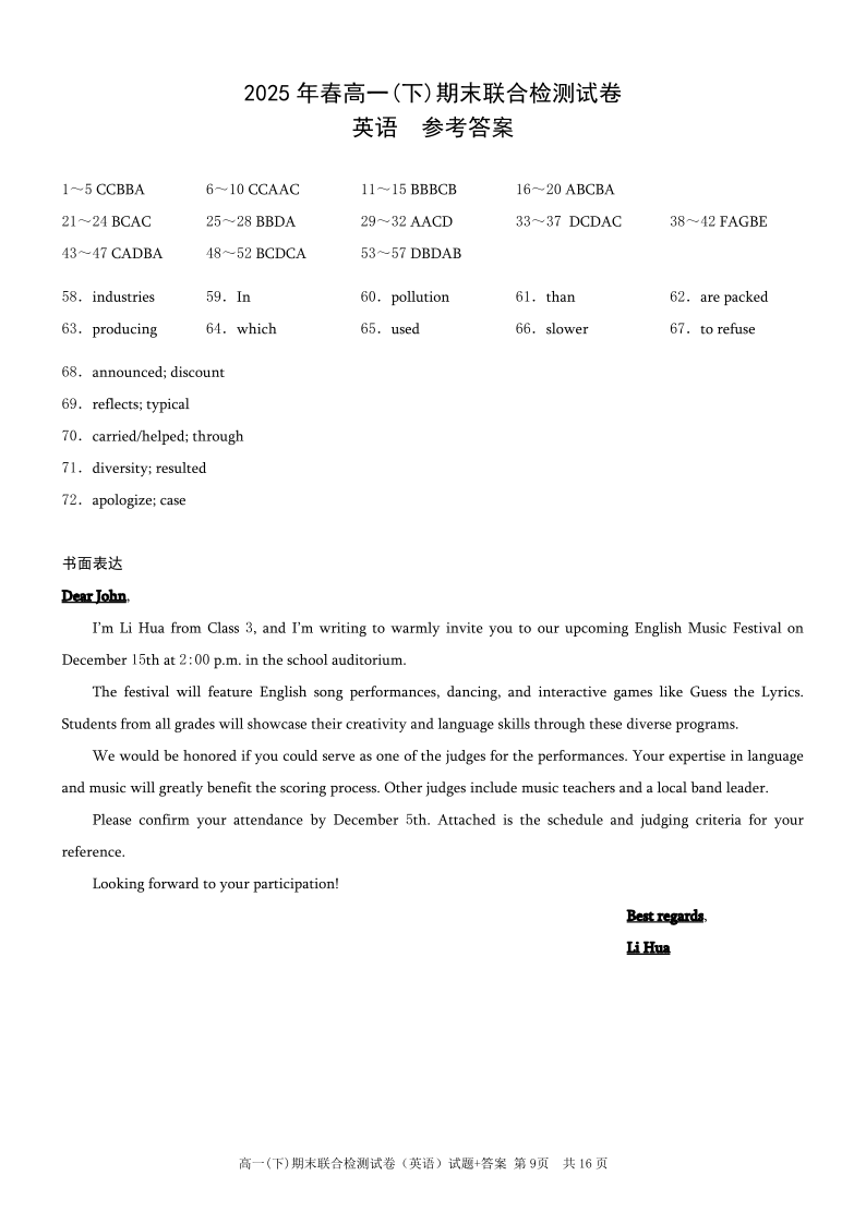 重庆市2025年高一下学期期末联合检测(康德卷)英语答案