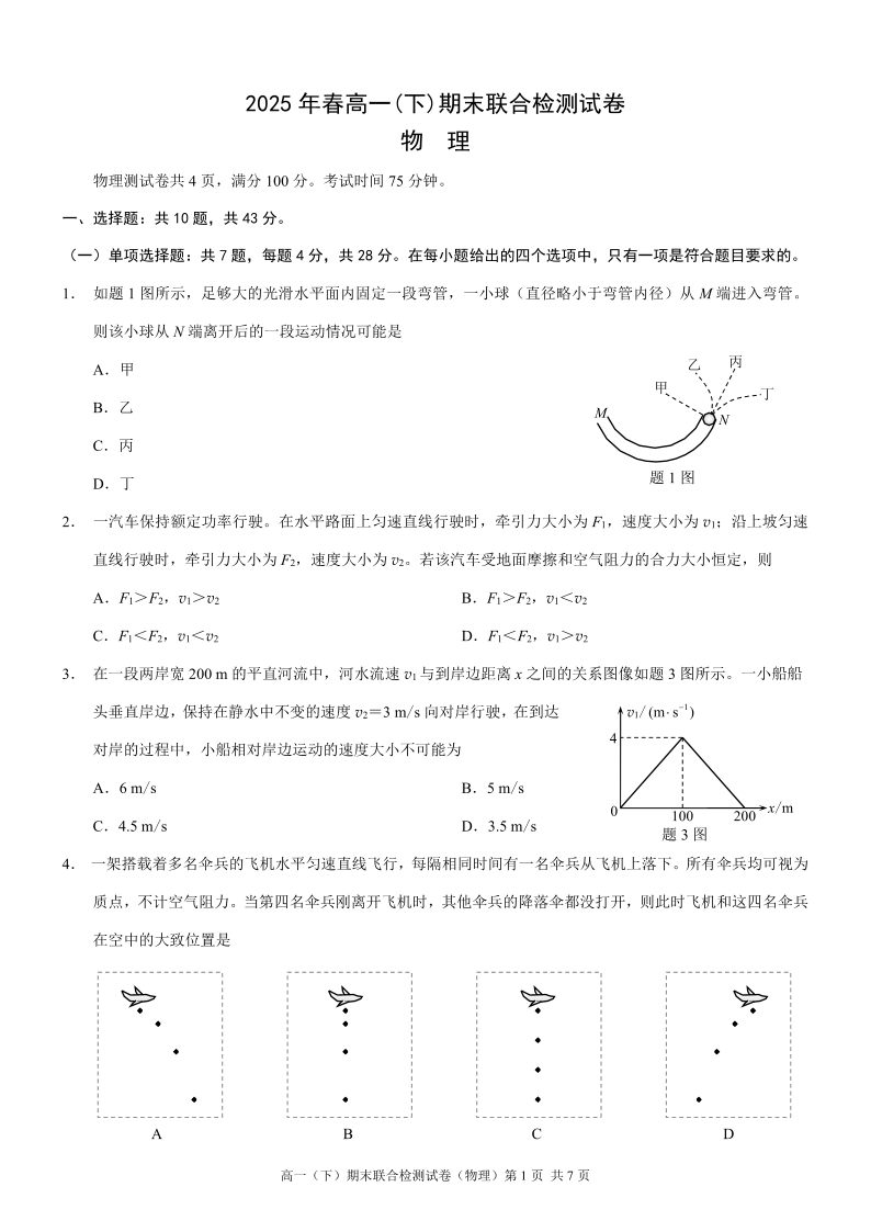 重庆市2025年高一下学期期末联合检测(康德卷)物理