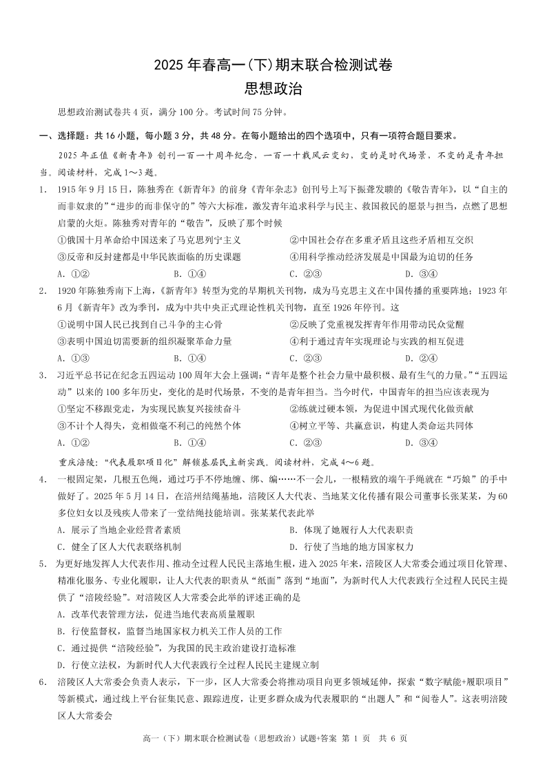 重庆市2025年高一下学期期末联合检测(康德卷)政治