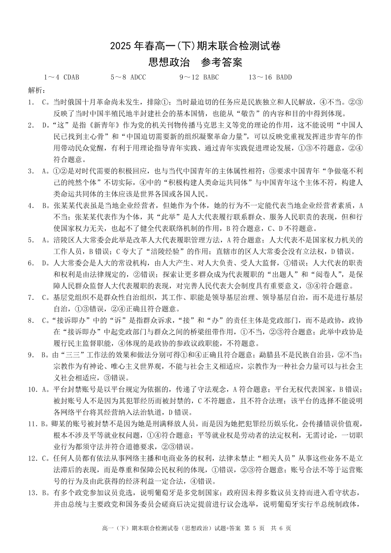 重庆市2025年高一下学期期末联合检测(康德卷)政治答案