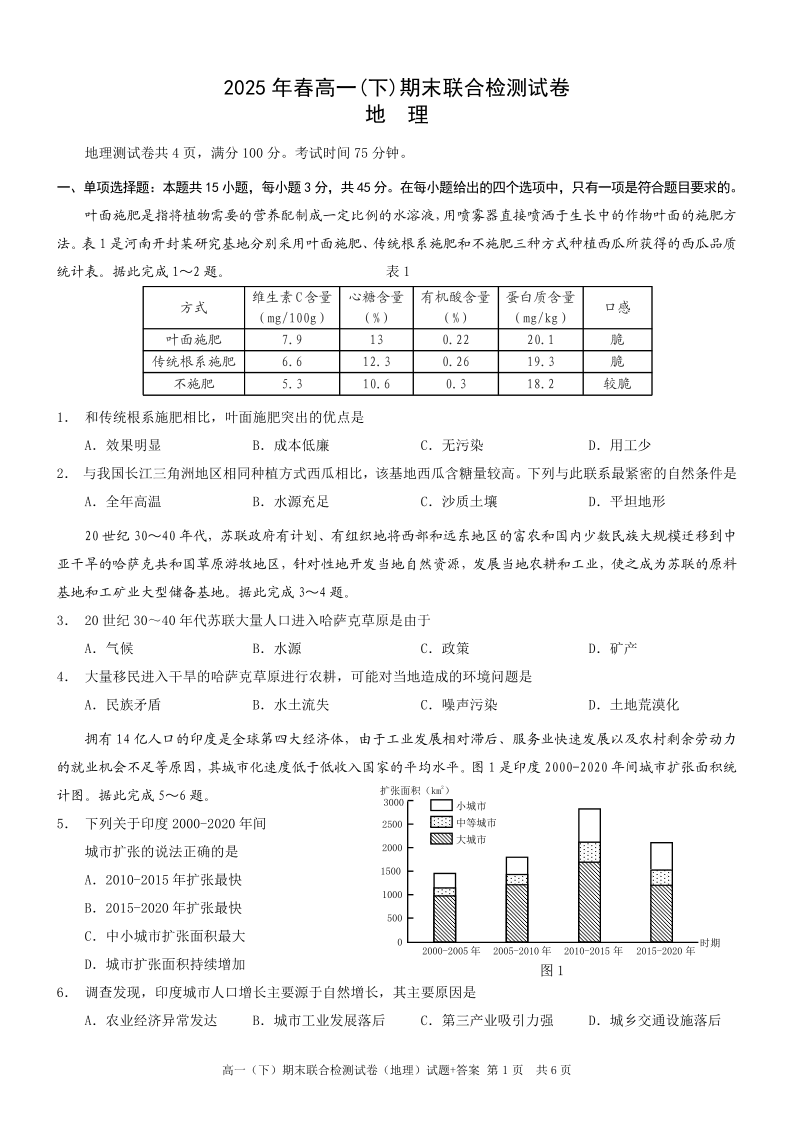 重庆市2025年高一下学期期末联合检测(康德卷)地理