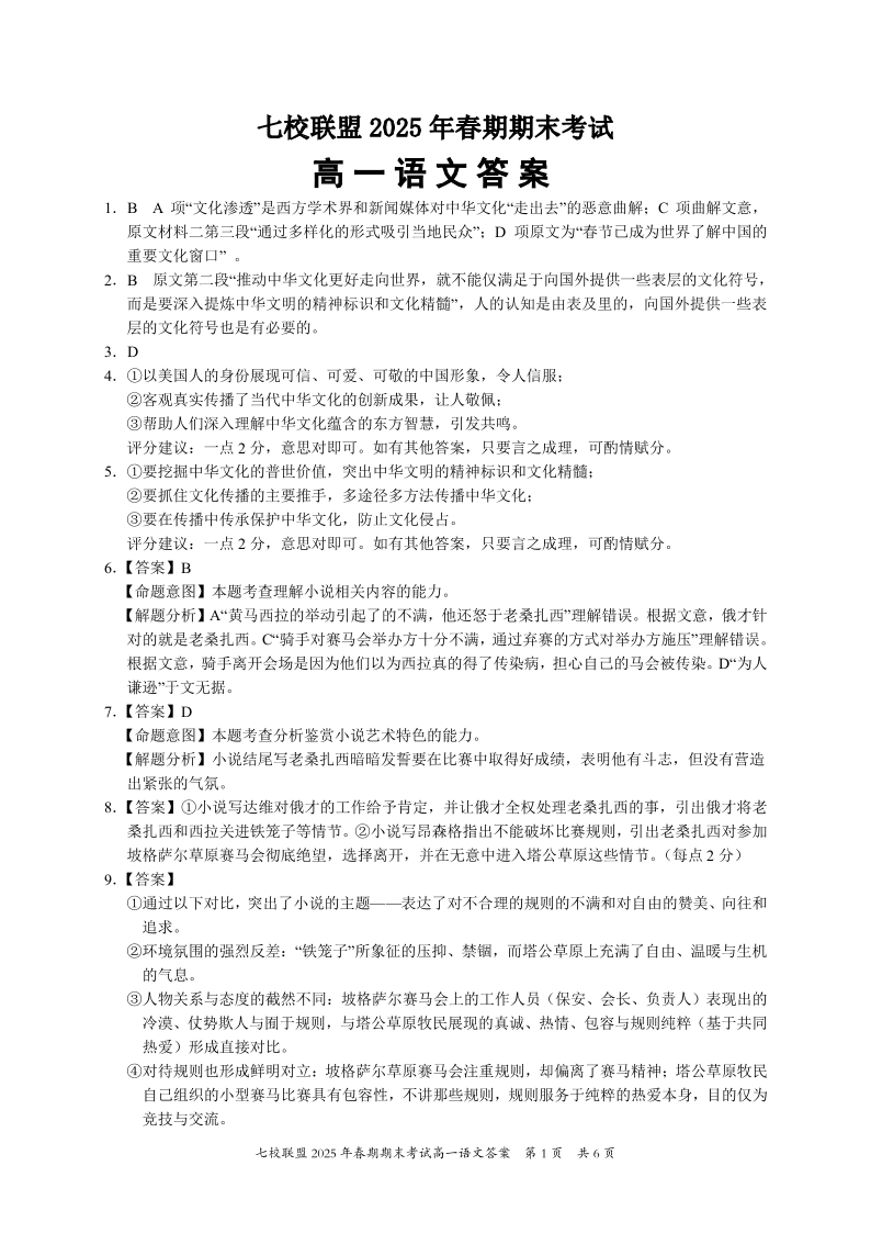 重庆市七校联盟2025年高一下学期期末考试语文答案