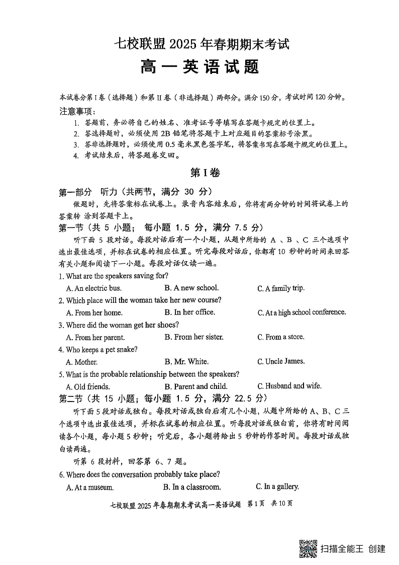 重庆市七校联盟2025年高一下学期期末考试英语+答案