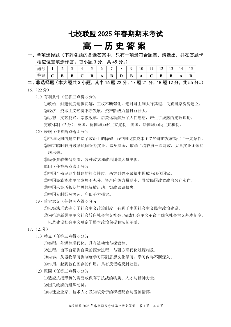 重庆市七校联盟2025年高一下学期期末考试历史答案