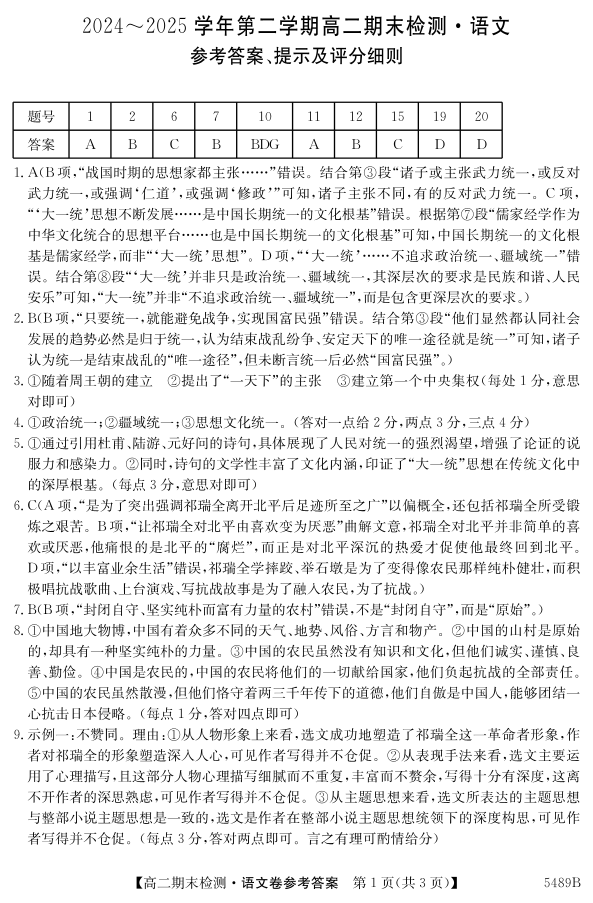 安徽省县中联盟2024-2025学年第二学期高二期末检测语文答案