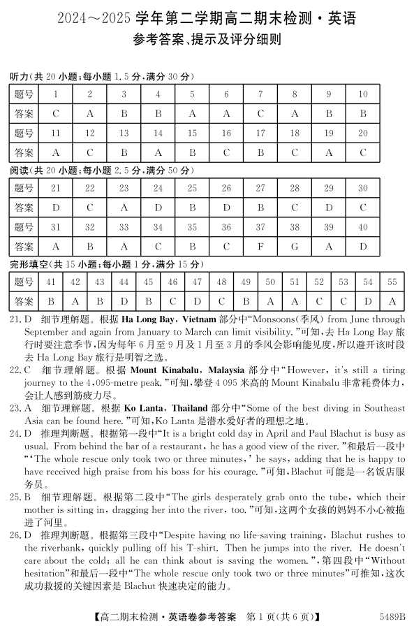 安徽省县中联盟2024-2025学年第二学期高二期末检测英语答案