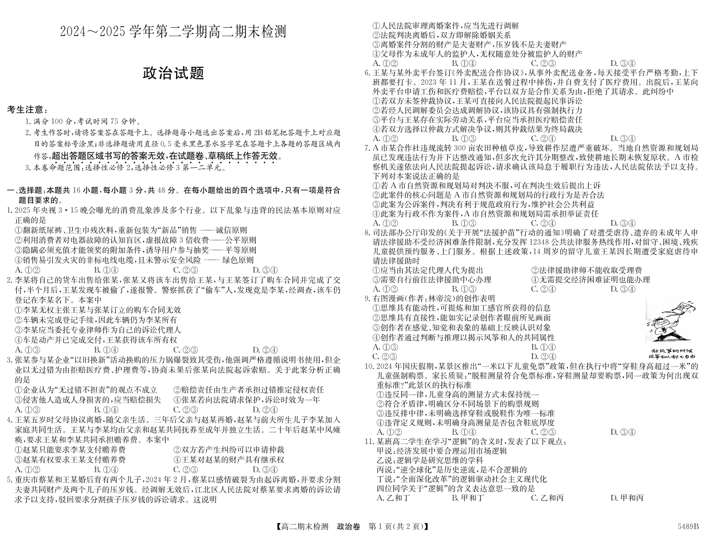 安徽省县中联盟2024-2025学年第二学期高二期末检测政治