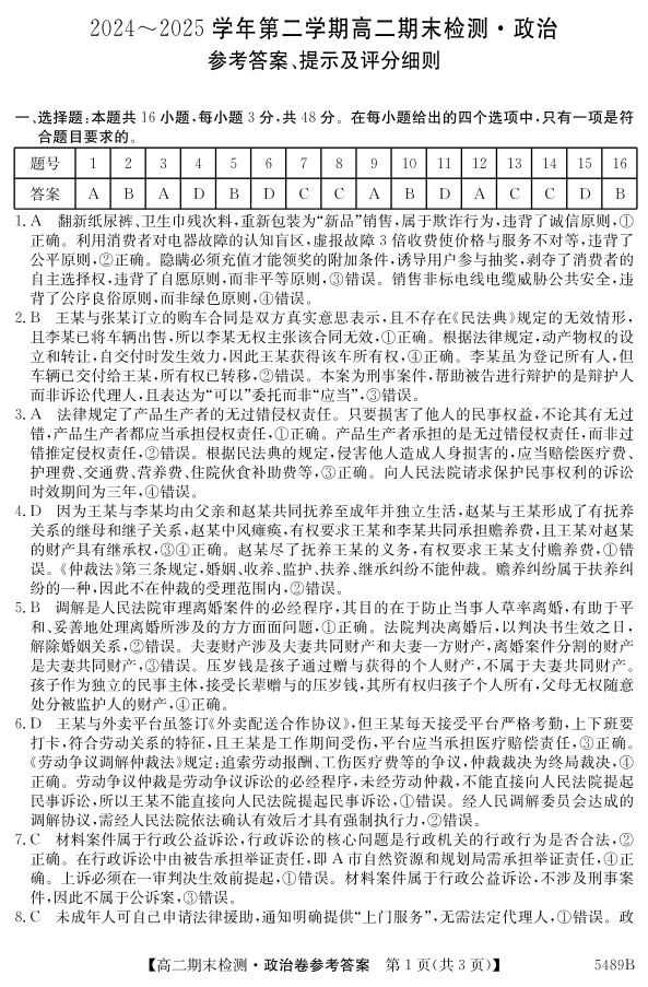 安徽省县中联盟2024-2025学年第二学期高二期末检测政治答案