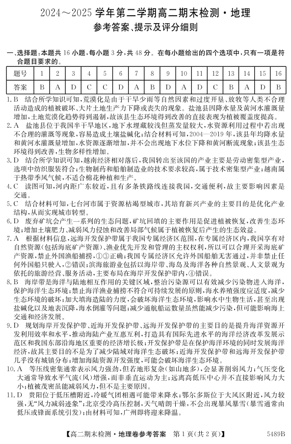 安徽省县中联盟2024-2025学年第二学期高二期末检测地理答案