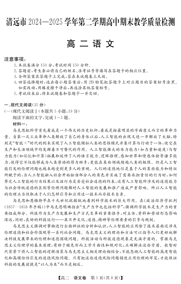 广东省清远市2024-2025学年第二学期高二期末教学质检语文