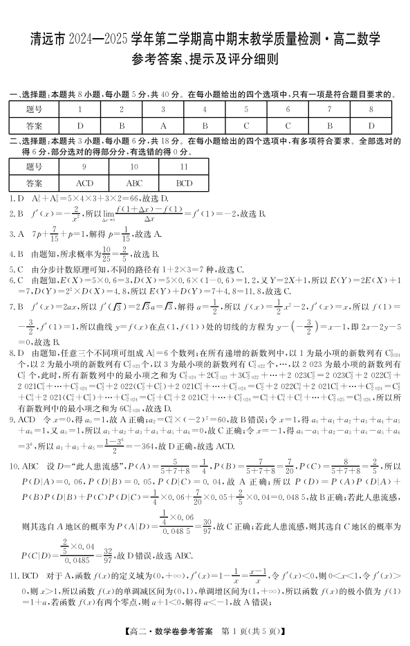 广东省清远市2024-2025学年第二学期高二期末教学质检数学答案