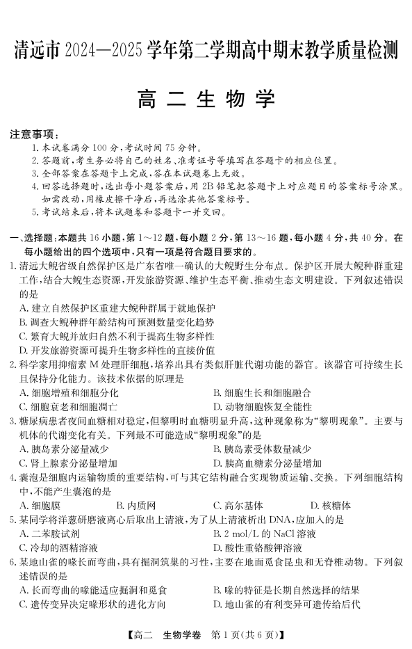 广东省清远市2024-2025学年第二学期高二期末教学质检生物