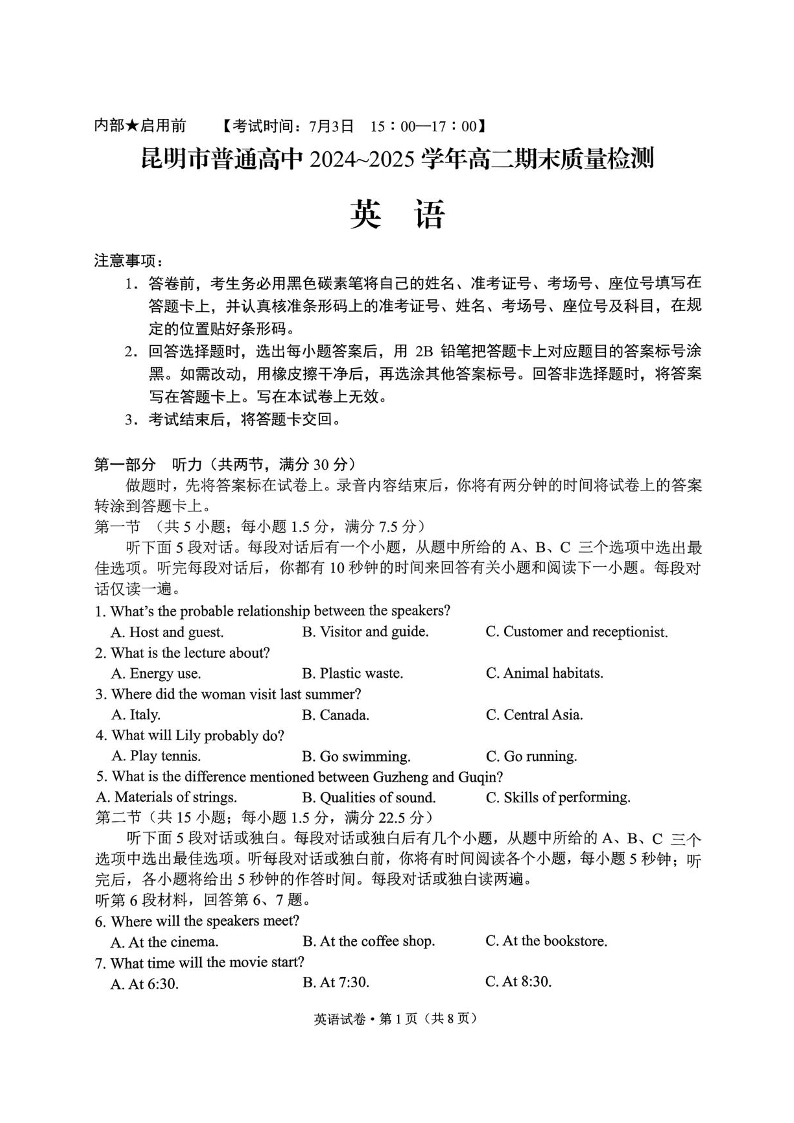 云南省昆明2024-2025学年高二下学期期末质量监测英语+答案