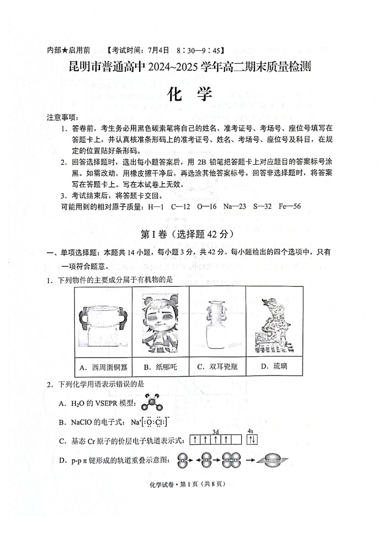 云南省昆明2024-2025学年高二下学期期末质量监测化学+答案