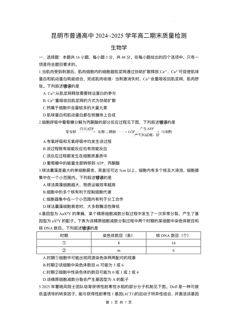 云南省昆明2024-2025学年高二下学期期末质量监测生物+答案