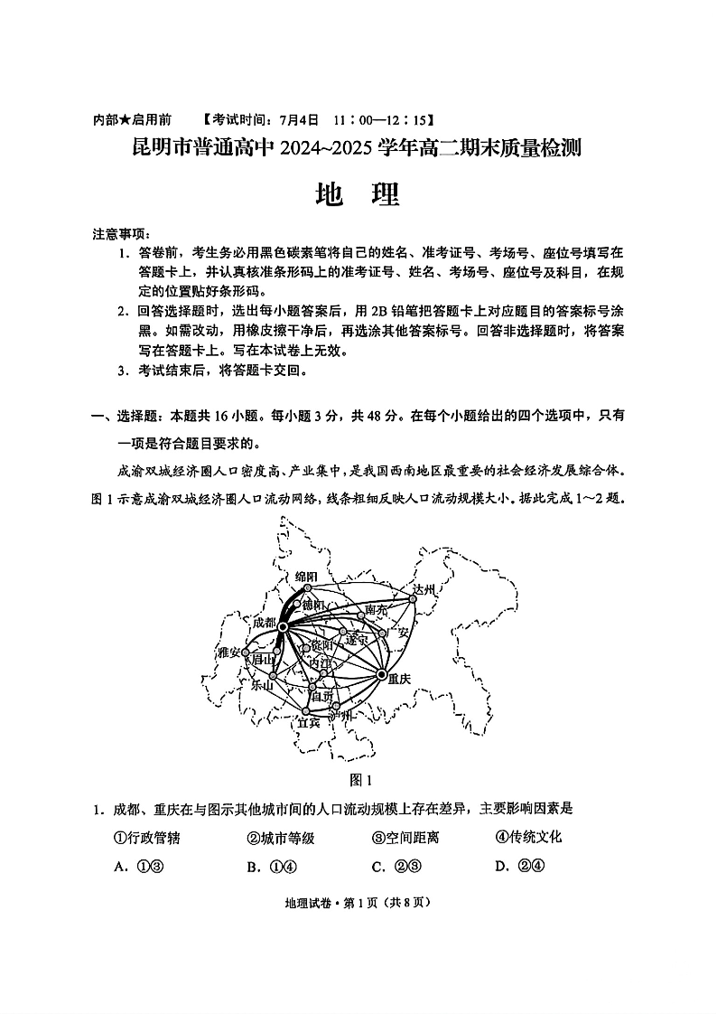 云南省昆明2024-2025学年高二下学期期末质量监测地理+答案