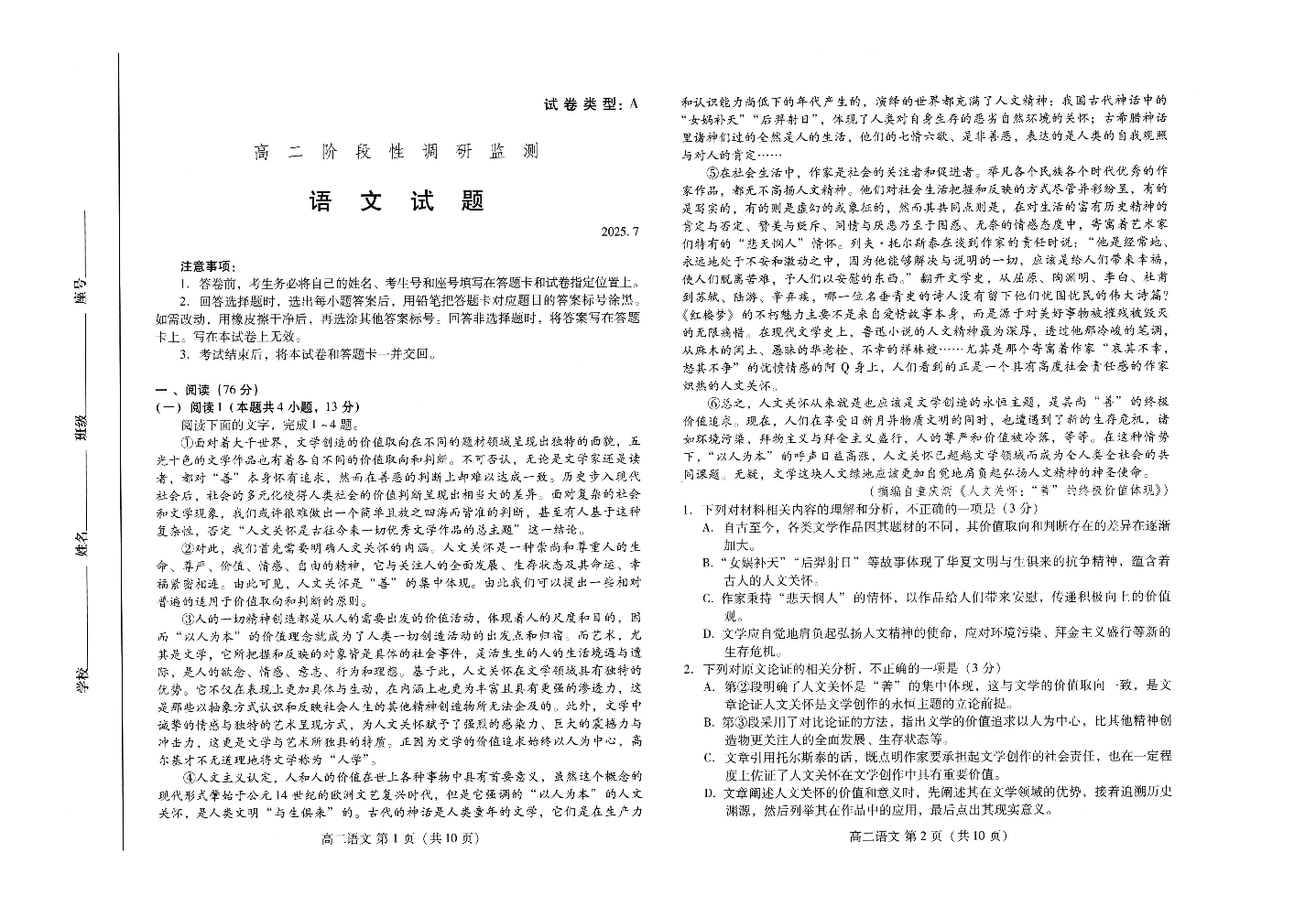 高二语文(山东省潍坊市2025.7阶段性调研监测)