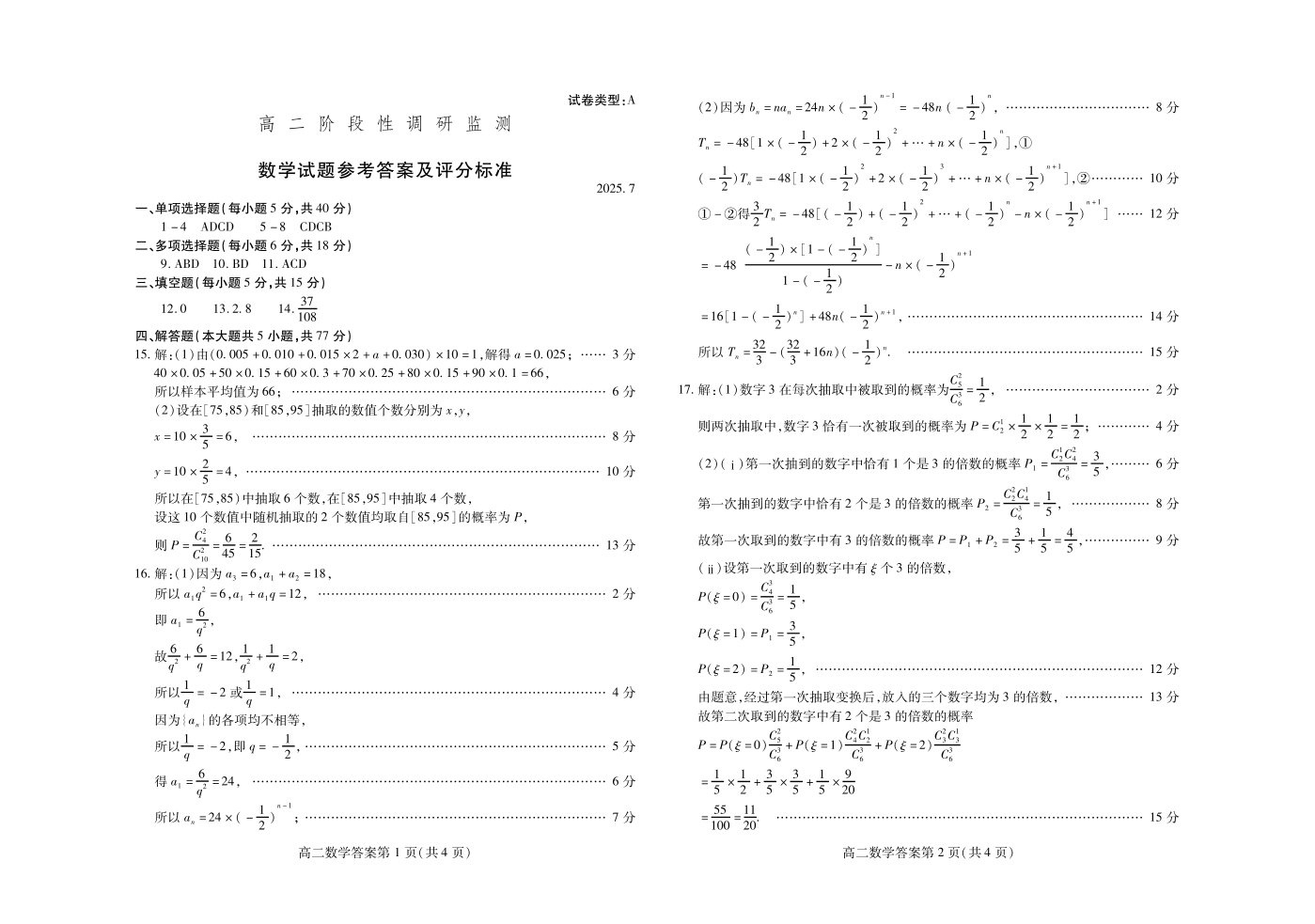 高二数学答案(山东省潍坊市2025.7阶段性调研监测)
