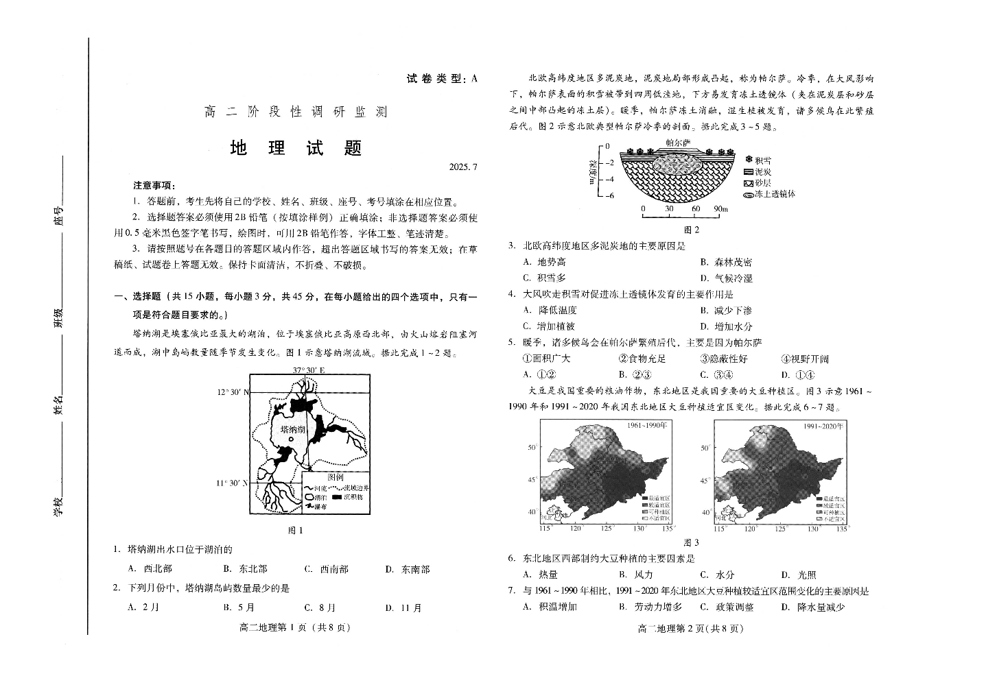 高二地理(山东省潍坊市2025.7阶段性调研监测)