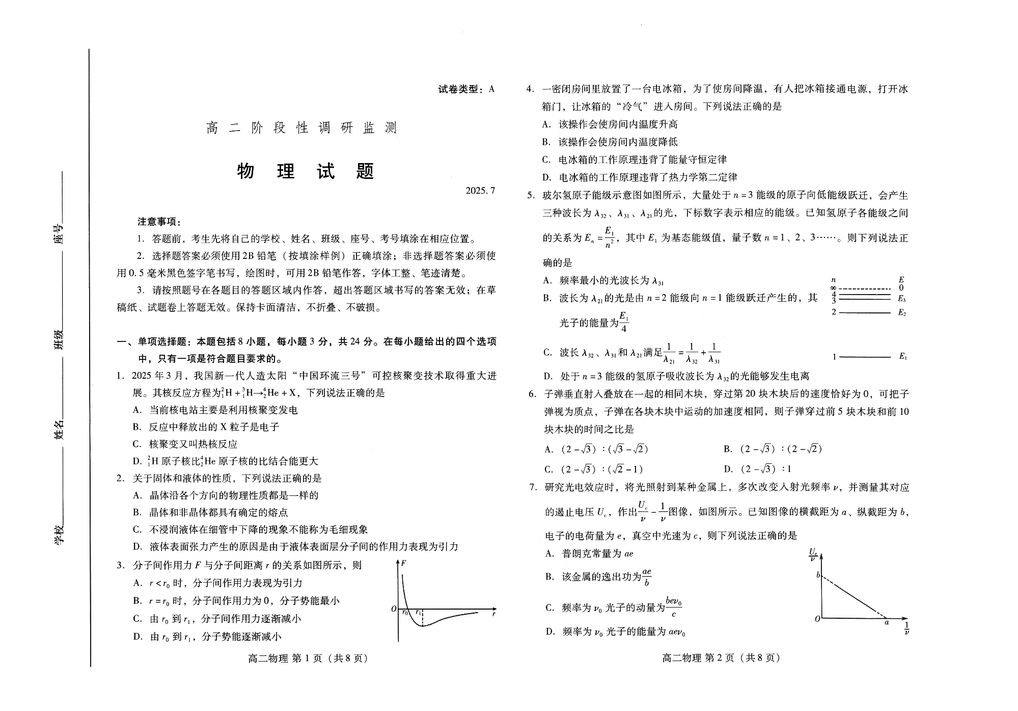 高二物理(山东省潍坊市2025.7阶段性调研监测)