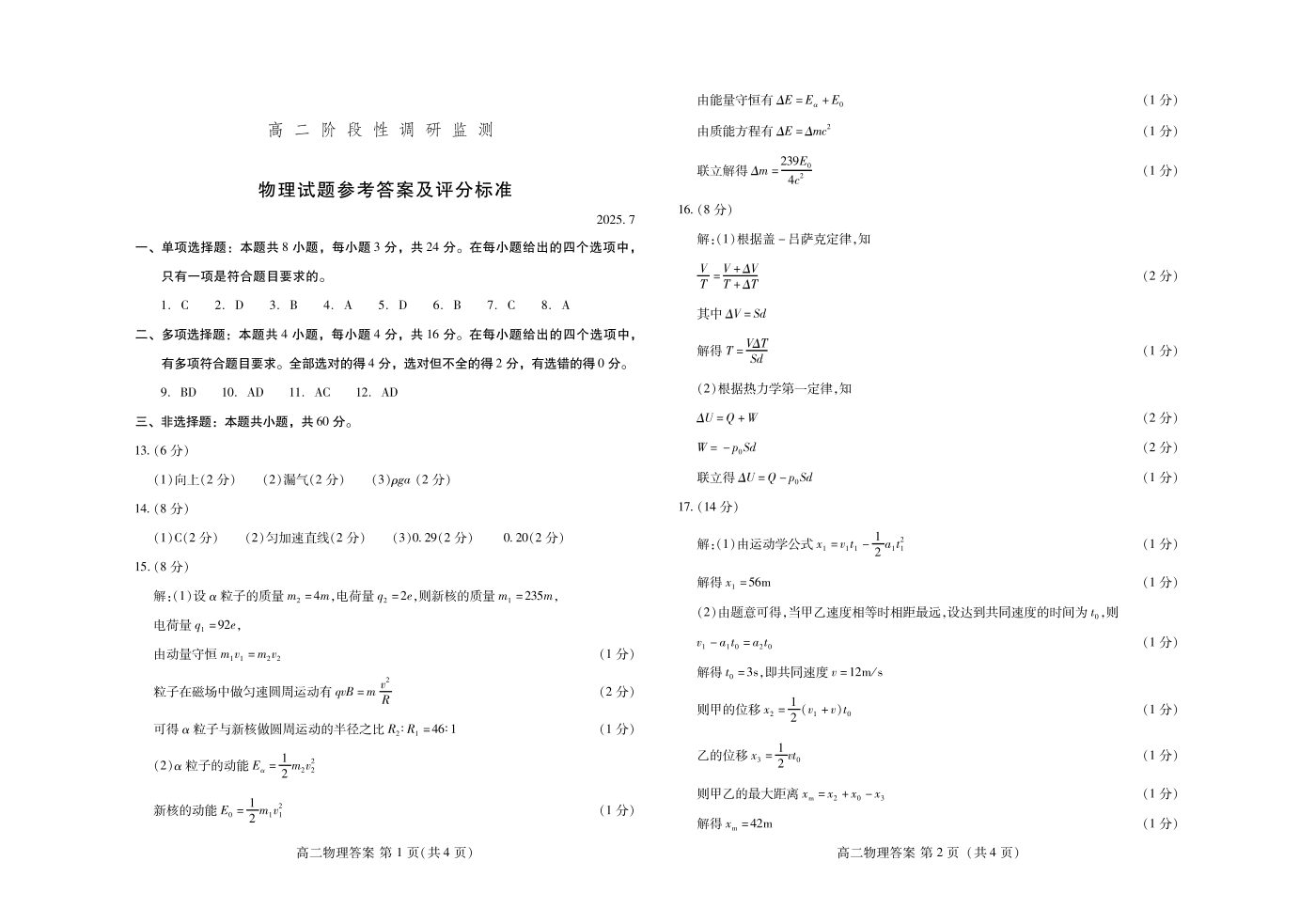 高二物理答案(山东省潍坊市2025.7阶段性调研监测)
