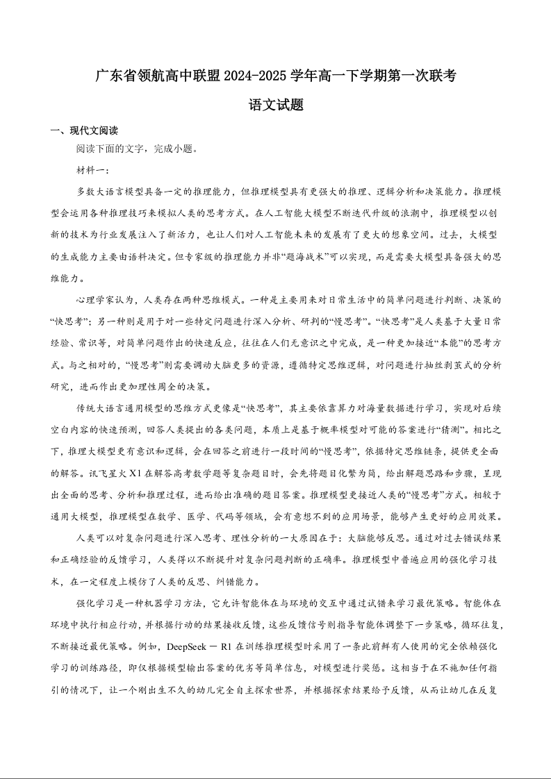 广东省领航高中联盟2024-2025学年高一下学期第一次联合考试语文+答案