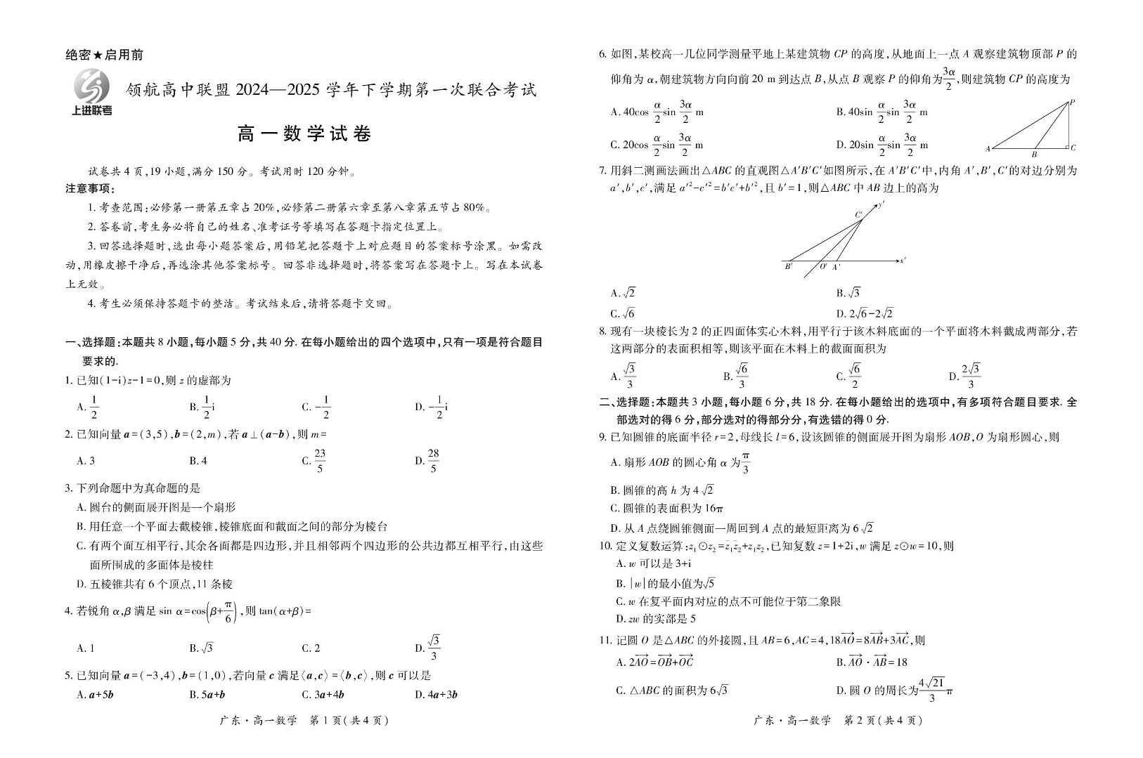 广东省领航高中联盟2024-2025学年高一下学期第一次联合考试数学+答案