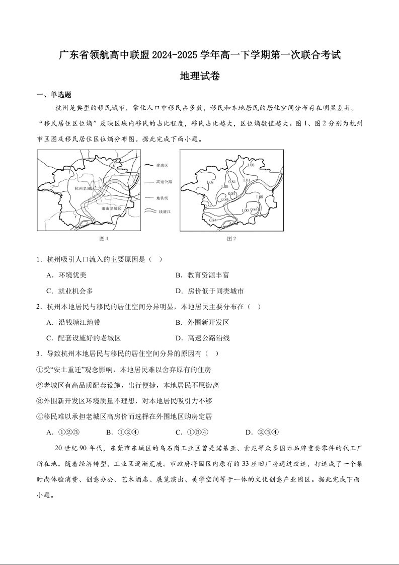 广东省领航高中联盟2024-2025学年高一下学期第一次联合考试地理+答案