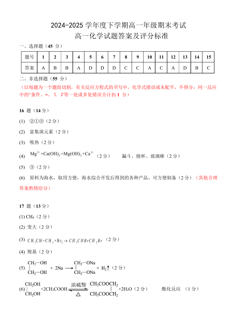 湖北省武汉市五校联合体2024-2025学年高一下学期6月期末化学答案