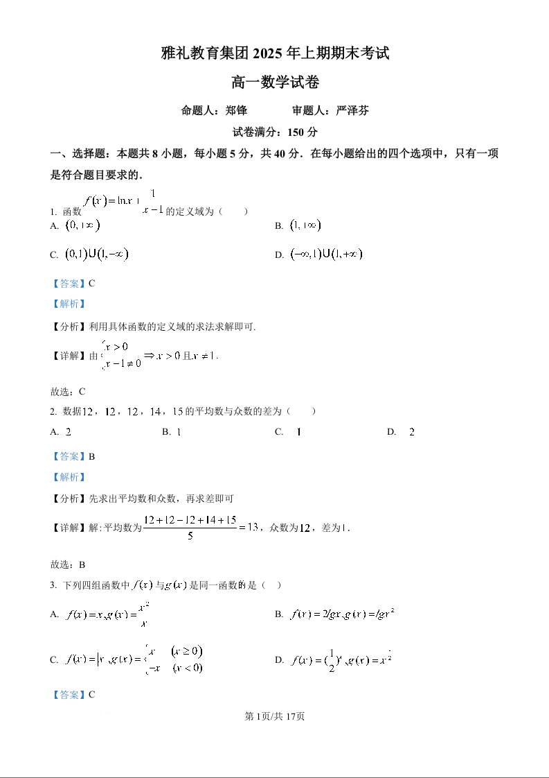湖南省长沙市雅礼中学2024-2025学年高一下学期6月期末数学(解析版)