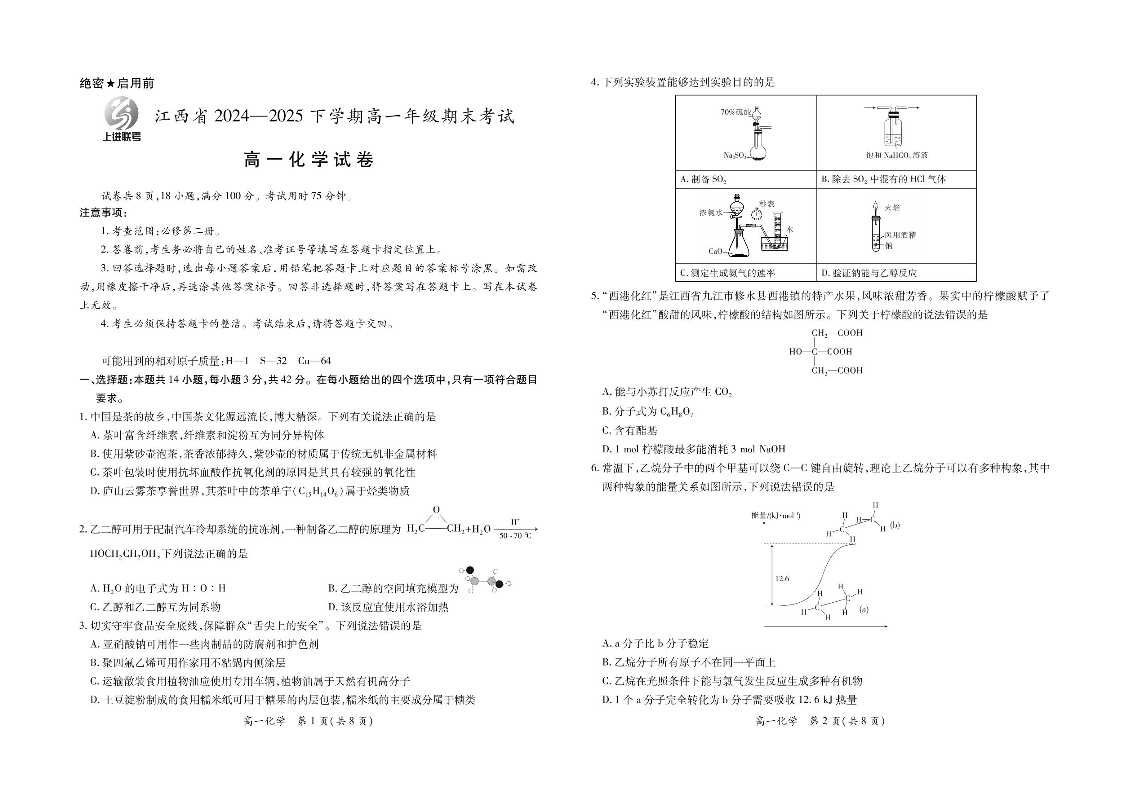 江西省上进教育联考2024-2025学年高一下学期期末考试化学+答案
