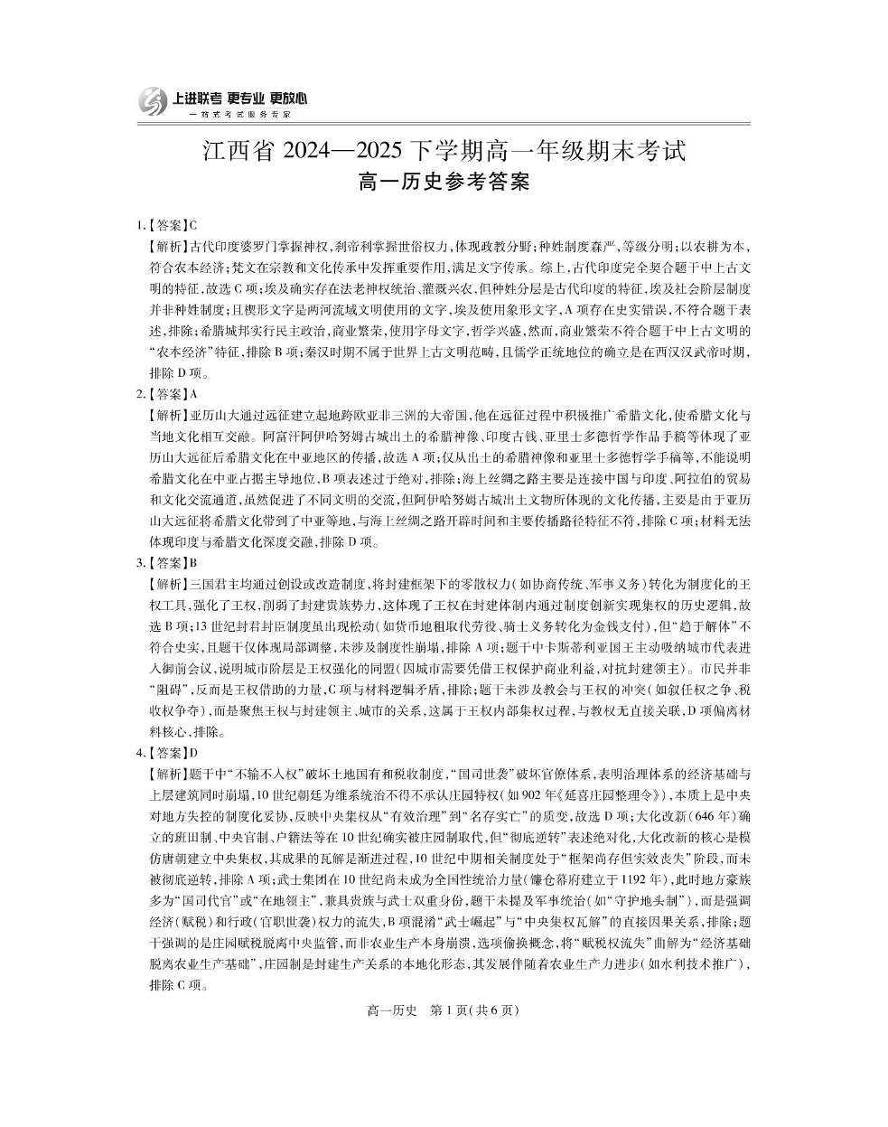 江西省上进教育联考2024-2025学年高一下学期期末考试历史答案