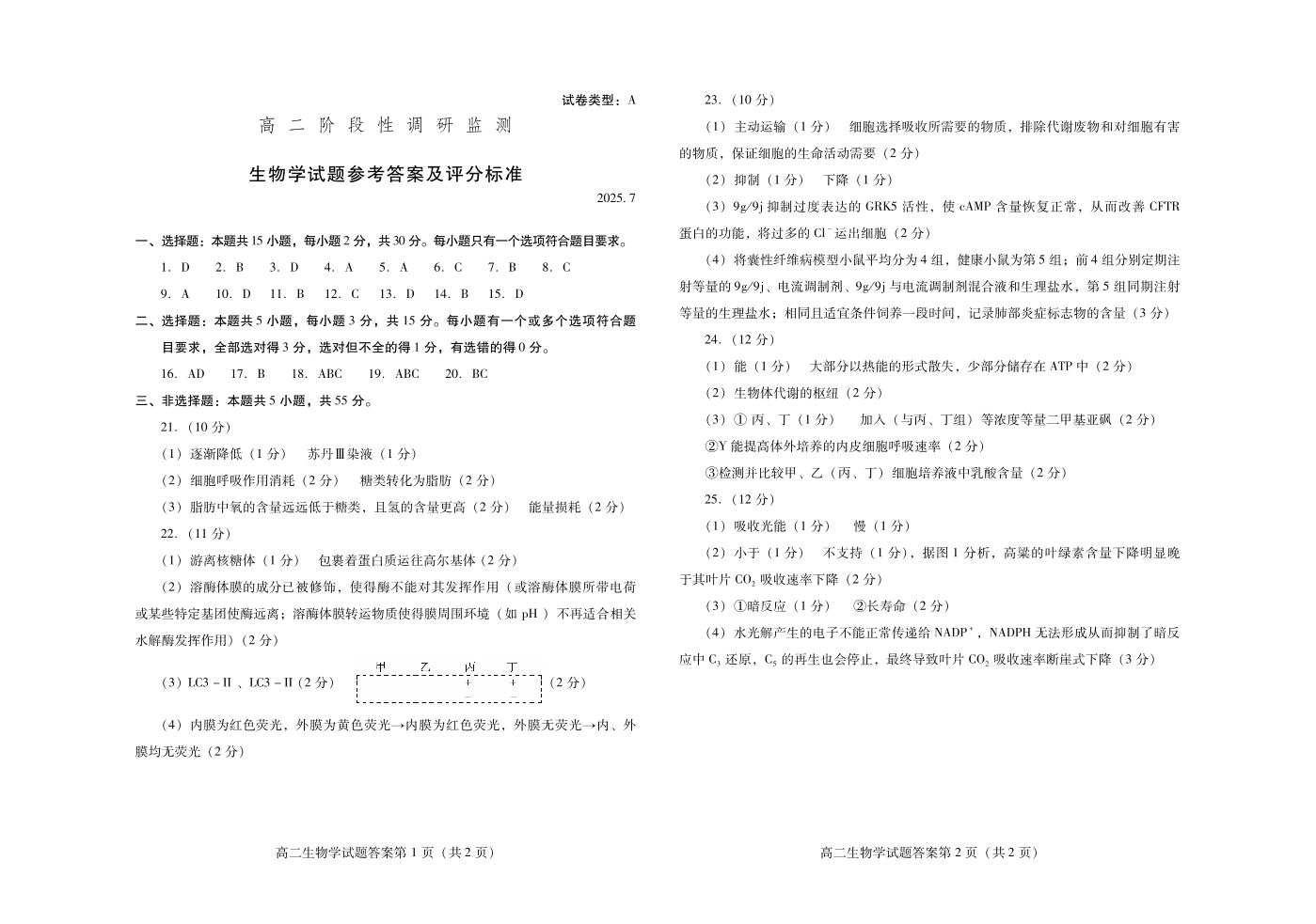 高二生物答案(山东省潍坊市2025.7阶段性调研监测)